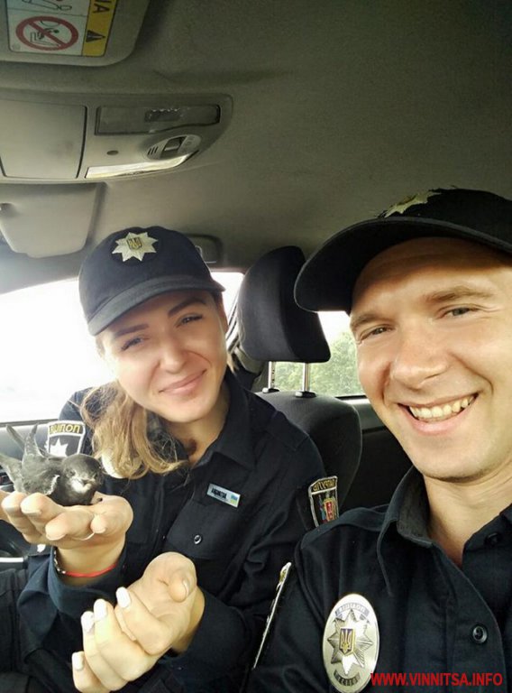 «Ми прибули до Гайсина у відрядження. Незабаром в Умані будуть відкривати Патрульну поліцію. Проводимо з населенням інструктаж про вступ на роботу до нашої інстанції. Крім того проводимо патрулі у Гайсині та Ладижині. Під час одного з таких у Гайсині, нам під ноги впало це пташеня. Піти далі, залишити його помирати не змогли. Тому і підібрали. Як з’ясували, це чорний стриж. Він спробував здійснити свій перший виліт. Він був невдалим. Летіти далі не може. Бо перебуває у шоковому стані. Та й мабуть, щось собі травмував. Ми його нагодували мухами, черв’ячками, які довелося шукати. Апетит є. Значить, буде жити. Але з напарником не маємо змоги доглядати пташку. Довеземо його до Немирова, там стрижа передамо іншому екіпажу. Вони його і довезуть до Вінниці», - розповіла з місця для Вінниця.info Олена Вотякова з Вінницької патрульної поліції.