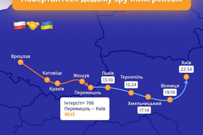 «З 12 червня час відправки Інтерсіті +706 з Перемишля зміщується на 10:15 (замість 08:00), що дасть можливість зручної пересадки з польського Інтерсіті 83173 Вроцлав-Перемишль.
