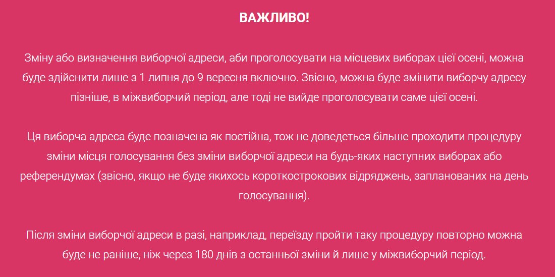 З 1 липня розпочинається процедура зміни виборчої адреси, аби всі виборці, які живуть не за місцем своєї реєстрації в паспорті або не мають реєстрації, змогли проголосувати восени на місцевих виборах. Процедуру необхідно буде пройти до 9 вересня включно. Ця процедура майже ідентична до тієї, яку проходили виборці під час президентських та парламентських виборів.