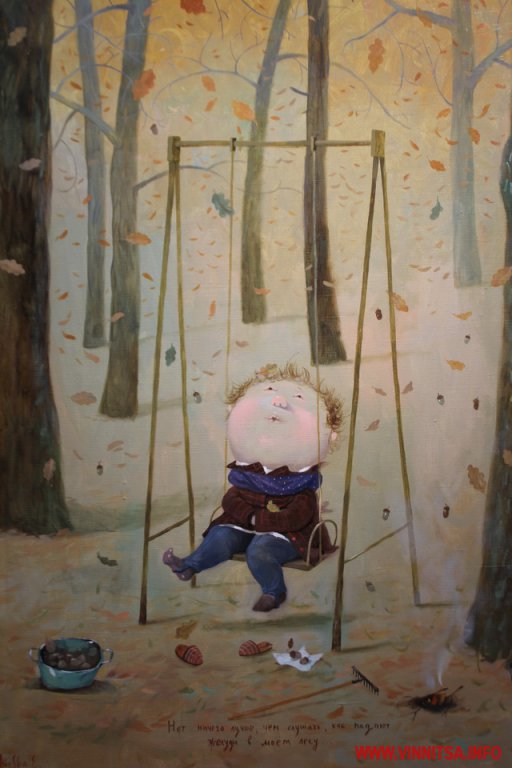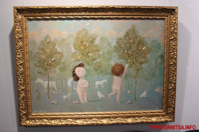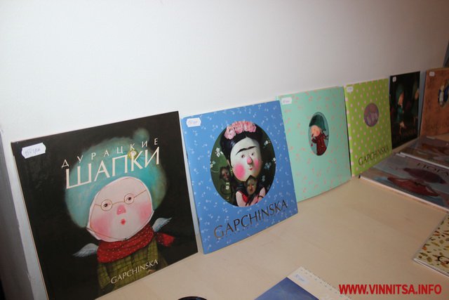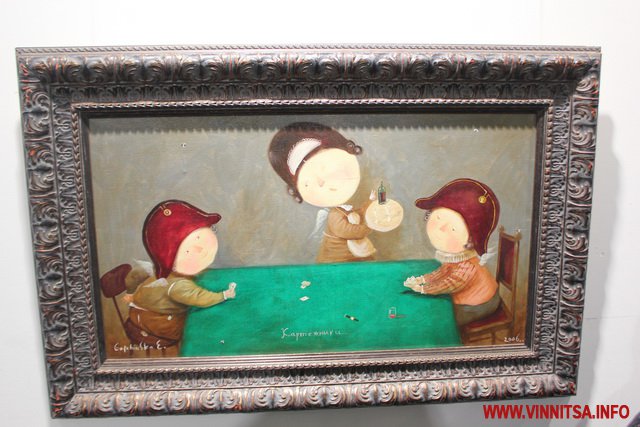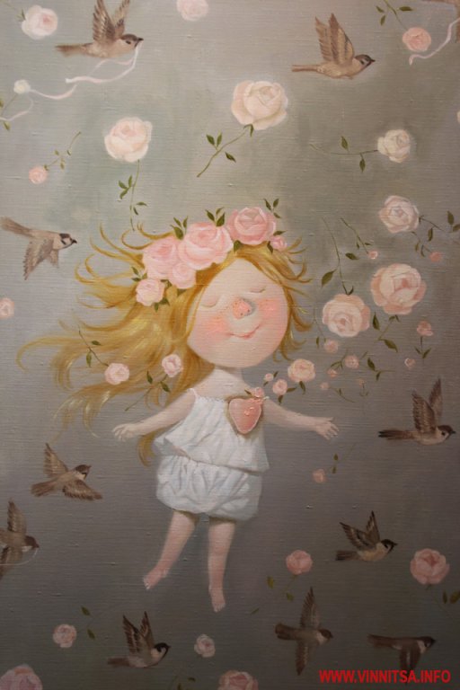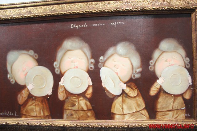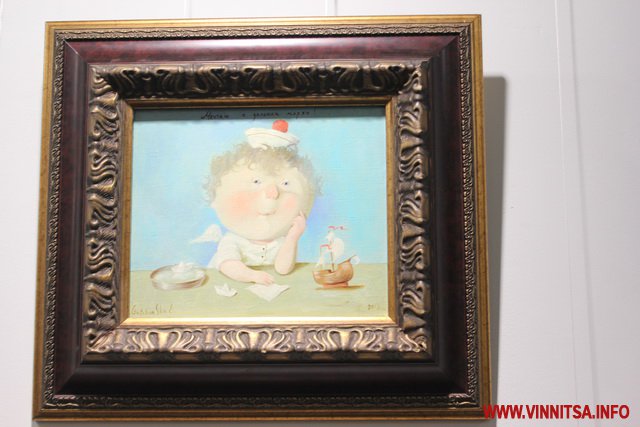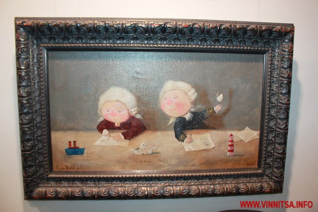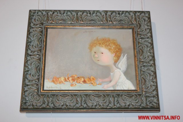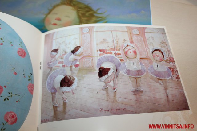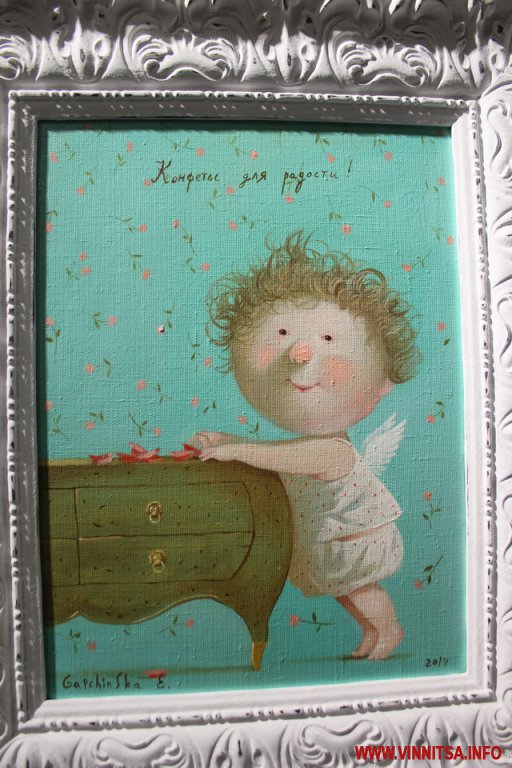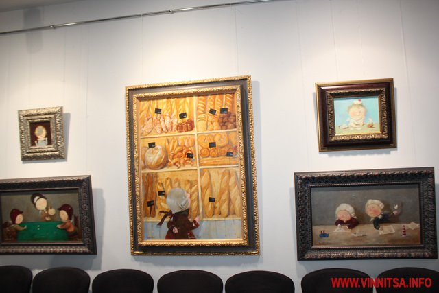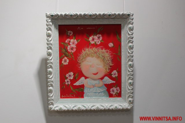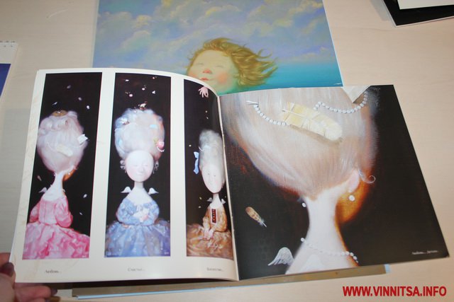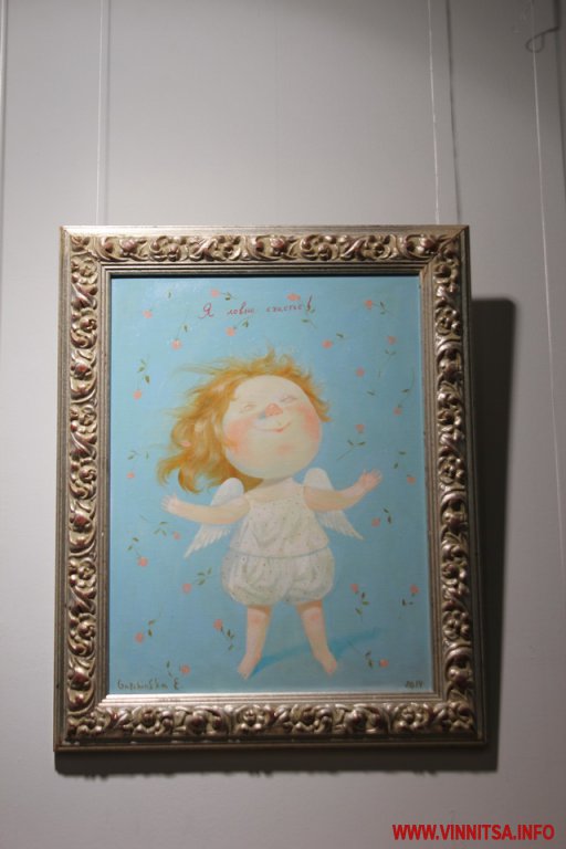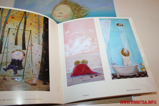 Окрім живописних картин із знаковими смішними чоловічками на цій виставці вінничани зможуть переглянути та придбати книжки, календарі та листівки авторки з незмінними зображеннями милих янголяток. Ціни на картини пристойно «кусаються», від 5 тисяч доларів, а ось календарі та книжечки більш доступніші для вінничан.
