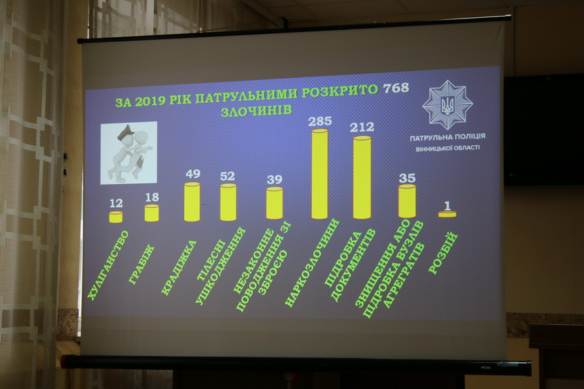 За словами начальника поліції, інспектори щоденно слідкують за дотриманням правил дорожнього руху не лише водіями, а й пішоходами. Протягом 2019 року до адміністративної відповідальності притягнули 1374 пішоходи. Крім того, інспекторами патрульної поліції винесено 30 256 постанов за порушення швидкісного режиму на загальну суму в 8 мільйонів 236 тисяч. З них сплачено добровільних штрафів на суму в 7 мільйонів 366 тисяч. Ще одним важливим аспектом у роботі патрульних є затримання осіб, які підозрюються у вчиненні злочинів. Протягом останнього року вінницькі охоронці порядку розкрили 768 кримінальних правопорушень, серед яких: хуліганство - 12, грабежі – 8, розбій – 1, крадіжки – 49, тілесні ушкодження – 52, незаконне поводження зі зброєю – 39, наркозлочини – 285, підробка документів – 212, знищення або підробка вузлів агрегатів – 35.