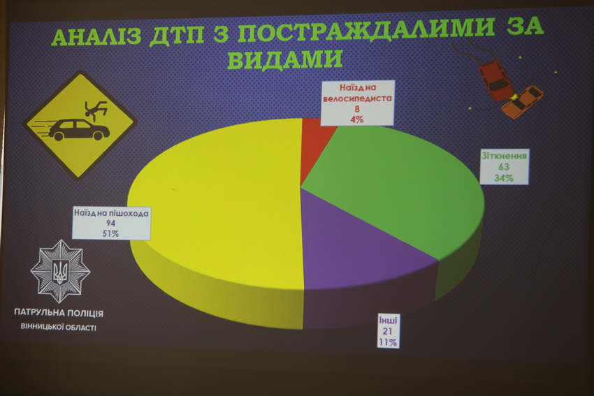 Зі 186 випадків, де постраждали люди, 94 випадки – це наїзди на пішоходів (51% від загальної кількості), 63 – зіткнення (34%), різного роду аварій (зіткнення з об’єктами, до прикладу) – 21 (11%) та 8 наїздів на велосипедистів, що складає 4%.