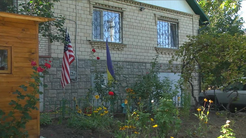 І дійсно, перед будинком з білої цегли помічаємо два прапори: України та США.