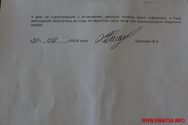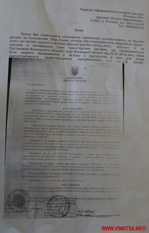 Віталій Шаповал приніс до редакції копію постанови Вінницького міського суду, в якій зазначено, що провадження по адміністративній справі закрито у зв’язку з відсутністю складу адміністративного правопорушення в діях Шаповала В. А.