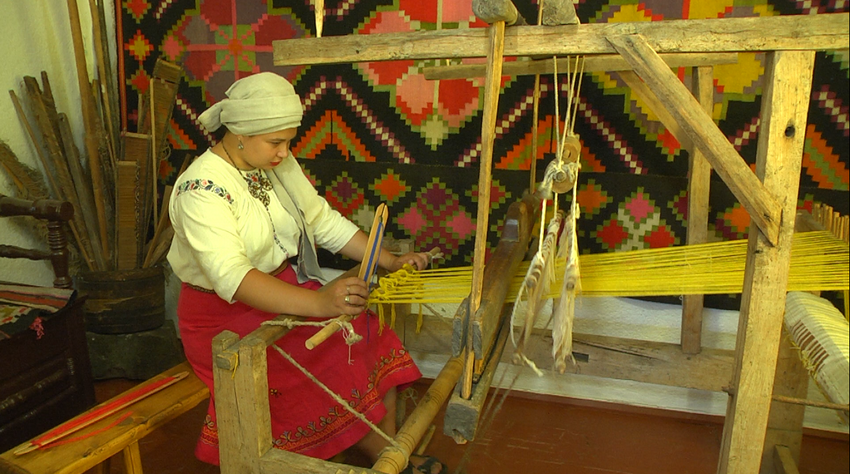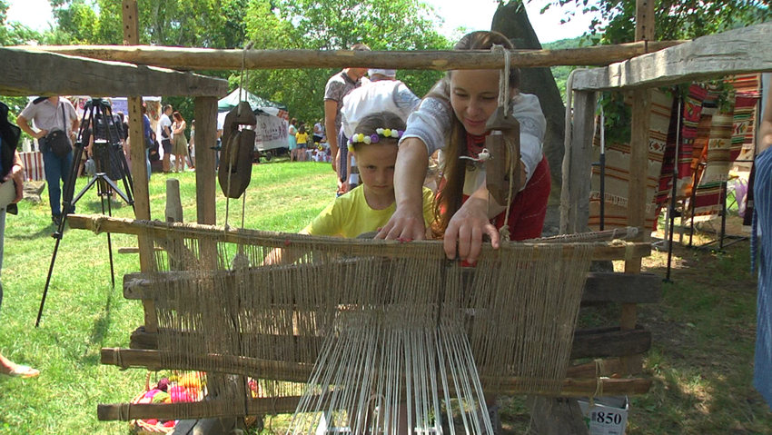 Один з верстатів розмістили просто неба. 12-річна Мар’яна вирішила спробувати попрацювати за ним. Навчає її Валентина з міста Богуслав, що на Київщині. Та має символічне прізвище - Ткач. Його отримала від чоловіка, який родом з Вінниччини. Валентина зауважує, вона килимарниця у третій династії.