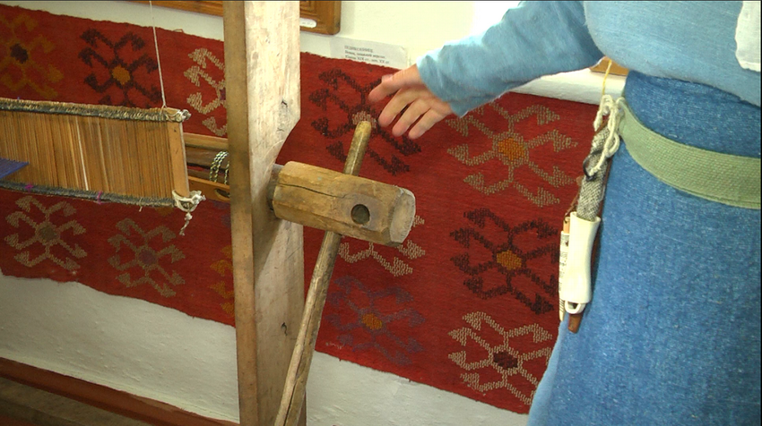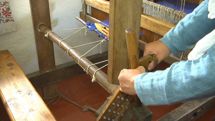 «На цих верстатах ми і трудилися. Я працювала ось за цим верстатом, він найстаріший у музеї. Датується кінцем 17 століття. Дерев’яна основа складається з двох частин. Певні балки замінили, які відповідають за натяг та роботу верстату. А нижні долівки, які є самою структурою, вони таки і можуть датуватися кінцем 17-го століття. Можу сказати, цей верстат має своєрідне тепло.Він має свій скрип, ритм. Якщо в більш сучасних верстатах, вони є трішки механічніші, вони є вправніші, то до цього верстату необхідно звикати. У нього є свій стиль роботи. У нього є свої педалі, має своє бердо. І от всі його гаджети та частинки, вони хочуть, щоби ти під нього підлаштовувався. Інакше, не буде з ним роботи», - демонструє принцип роботи Олена Сіра.