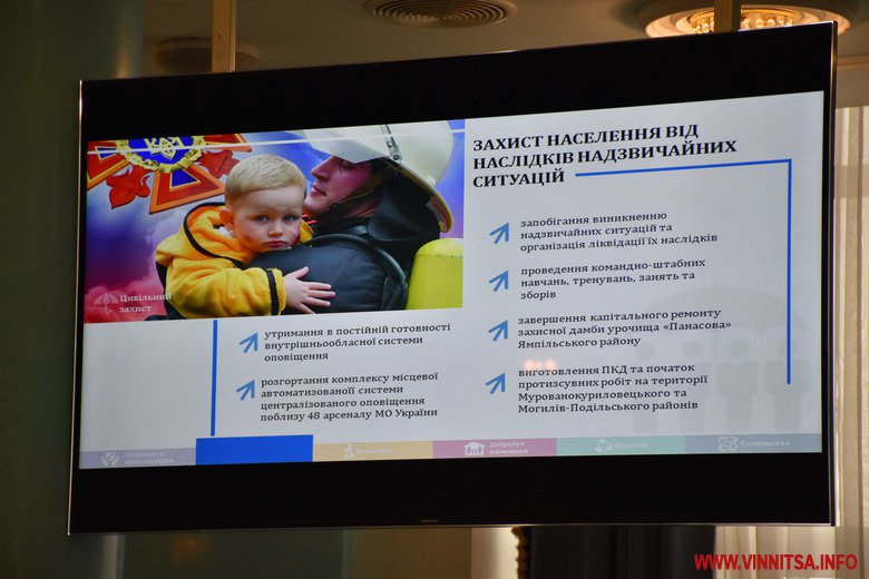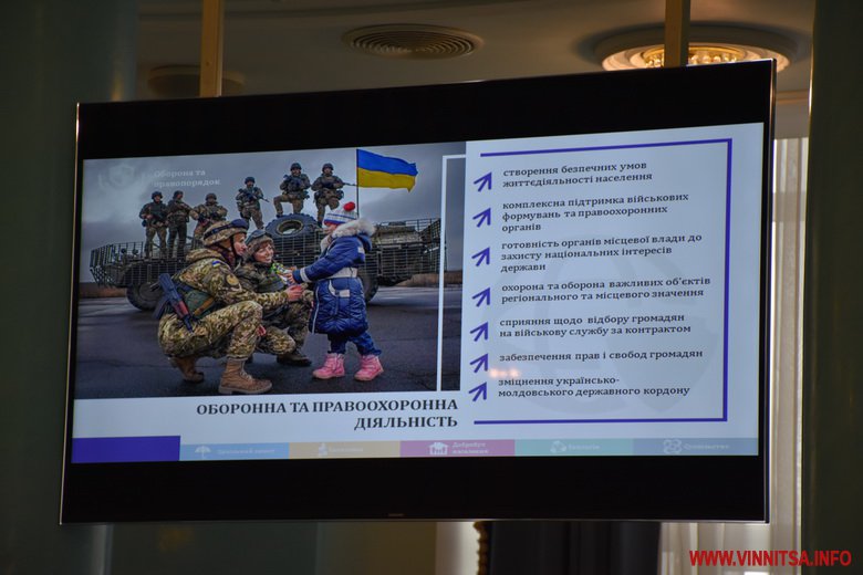 Заплановано створення безпечних умов життєдіяльності населення, підвищення ефективності комплексної правоохоронної програми області «Безпечна Вінниччина», продовження реалізації проекту «Безпечне місто», зміцнення Придністровсько-Молдовського кордону. В наступному році значна увага приділятиметься наданню шефської допомоги військовим формуванням, частинам ЗСУ, Нацгвардії, прикордонної служби і правоохоронним органам.