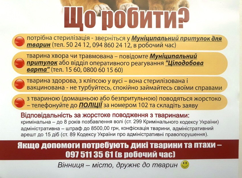 Нагадаємо, що у Вінниці муніципальний притулок для тварин пропонує безкоштовну стерилізацію безпритульних кішок. Тваринам роблять операцію, вакцинують та повертають опікуну (людині, яка привезла кішку). Щоб записати кицьку на безкоштовну стерилізацію, потрібно зателефонувати до Людмили Сидорук – (067) 976-97-57; (063) 289-04-02. Або одразу в притулок - (0432) 50-24-12;(094) 860-24-12.