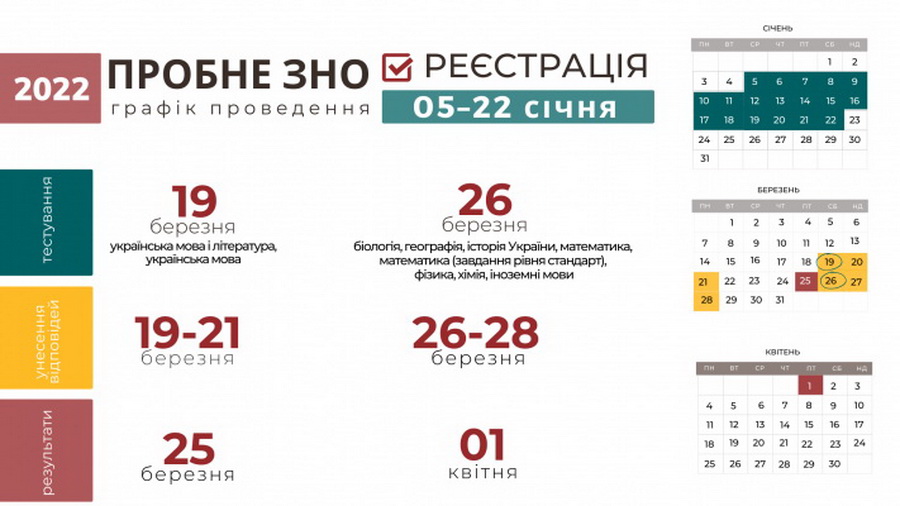 Відповідно до наказу Українського центру оцінювання якості освіти від 20 жовтня 2021 року №141 «Про проведення пробного зовнішнього незалежного оцінювання в 2022 році» пробне ЗНО відбудеться: