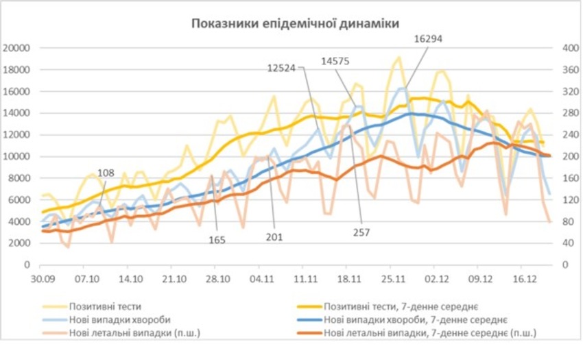 Від 14–20 грудня зроблено 250417 ПЛР-тестів і виявлено 70327 нових інфікованих. Кількість ПЛР-тестів, витрачена на одного нового інфікованого, становить у середньому 3.6 ПЛР-тесту на одне нове виявлення, що на 14% більше від аналогічного показника минулого тижня та відповідає середньому відсотку виявлення 27.7% для України загалом. Позитивність за результатами тестів (відношення кількості позитивних тестів до кількості ПЛР-тестів) – стабілізувалася на рівні 32%. Обсяги тестування стабілізувалися.