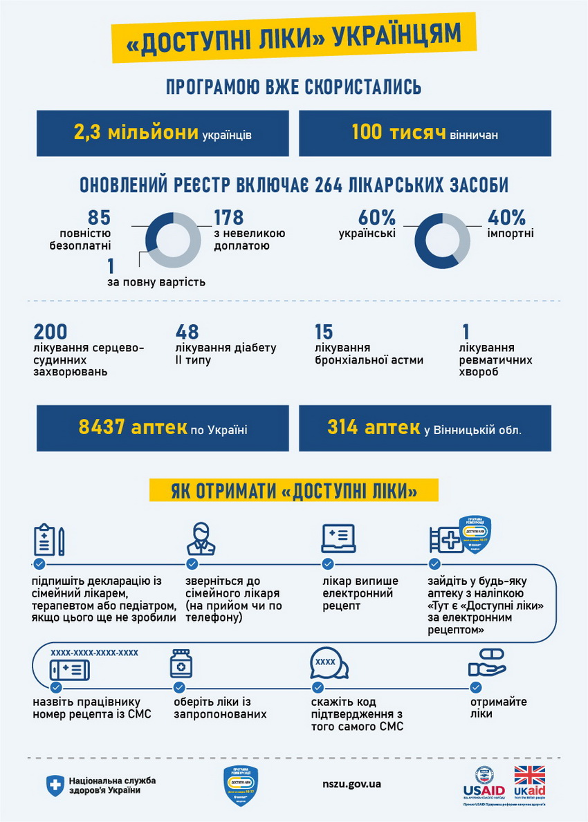 12 серпня затверджено оновлену редакцію реєстру лікарських засобів, які підлягають реімбурсації за програмою «Доступні ліки». Кількість ліків у реєстрі збільшено та НСЗУ готує подальше розширення державної програми на 2021 рік. Із початку 2020 року в межах програми мешканці Вінниччини отримали медикаменти за 353-ма тисячами рецептів. З них 265 тисяч рецептів відпущено на ліки від серцево-судинних захворювань, 76,8 тисяч – від цукрового діабету ІІ типу та 11,1 тисяч – від бронхіальної астми. У програмі зареєстровано 314 аптек й аптечних пунктів області, за цей рік вони вже отримали відшкодування від держави 25 млн грн.