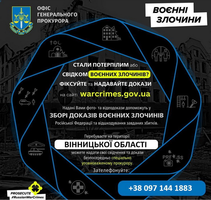 «Якщо ви стали потерпілим, або свідком воєнних злочинів рф проти цивільного населення, фіксуйте та надсилайте докази. Офісом Генпрокурора створено головну платформу збору злочинів рф», - із такою заявою до мешканців та гостей Вінниччини звернулися у пресслужбі Вінницької обласної прокуратури.