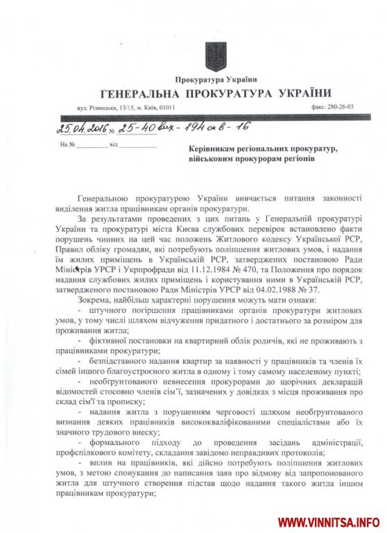 Провести перевірки законності виділення житла працівникам органів прокуратури з 2010 року до цього часу, взяття їх на квартирний облік.