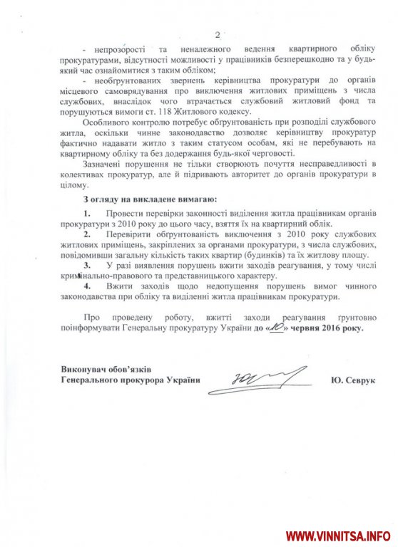Вжити заходів щодо недопущення порушення вимог чинного законодавства при обліку та виділенні житла працівникам прокуратури», - йдеться в дорученні Ю.Севрука.