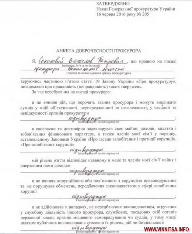 На сайті «Генеральної прокуратури України» на вимогу генпрокурора Юрія Луценка відкрито розділ на шість сторінок, де близько трьохсот вінницьких прокурорів підписали так звані анкети доброчесності. Керівники обласної прокуратури до анкет також додали декларації про доходи за 2015 рік.