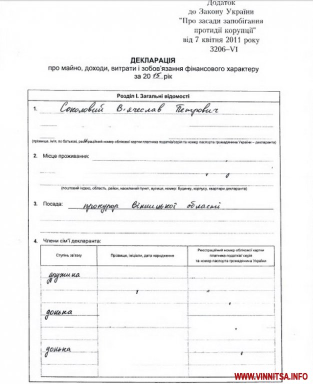 Прокурор Вінницької області, державний радник юстиції 3 класу В’ячеслав Петрович Соколовий у декларації про доходи за 2015 рік вказав у графі «члени сім’ї» дружину та двох дочок. Загальна сума доходу прокурора за документом складає 315 487 грн., сукупно на членів його родини – 169 200 грн.