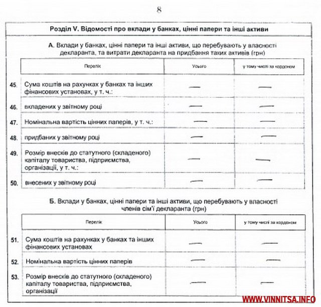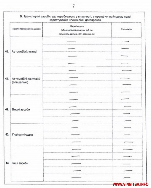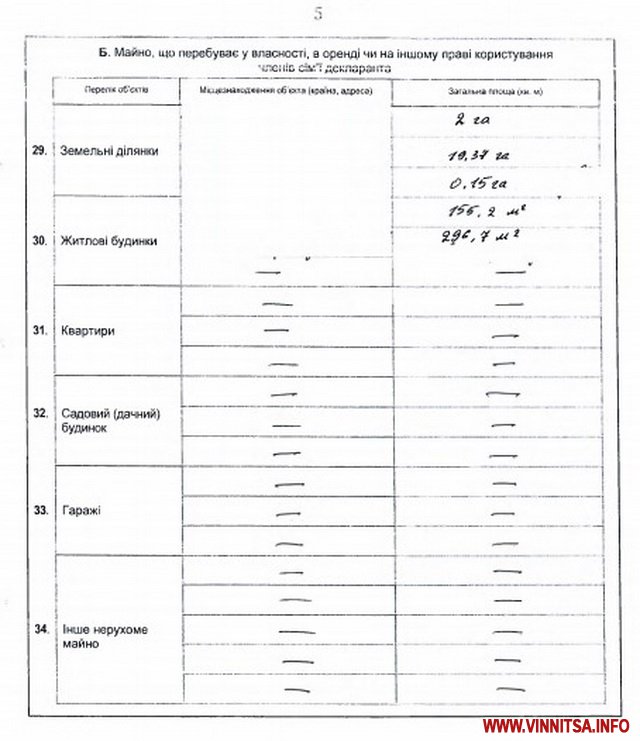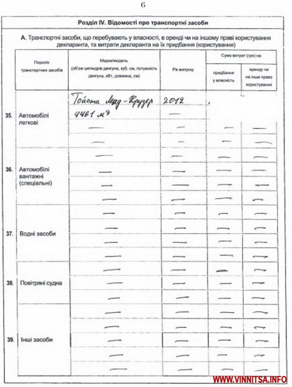 Автомобілі декларанта – «Toyota Land Cruiser» 2012 року випуску, 4461 кв.м. Прочерки стоять навпроти граф про наявність гаража, рахунків у банках, страхування та недержавного пенсійного забезпечення.