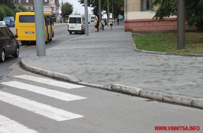 Нещодавно у Вінниці завершилися роботи по капітальному ремонту ділянки тротуару по проспекту Коцюбинського. Окрім плитки тут прокладено водовідвідні лотки та облаштовано пандуси для візочників і мам з дитячими візками. У планах – покласти на тролейбусній зупинці тактильну плитку для слабозрячих.
