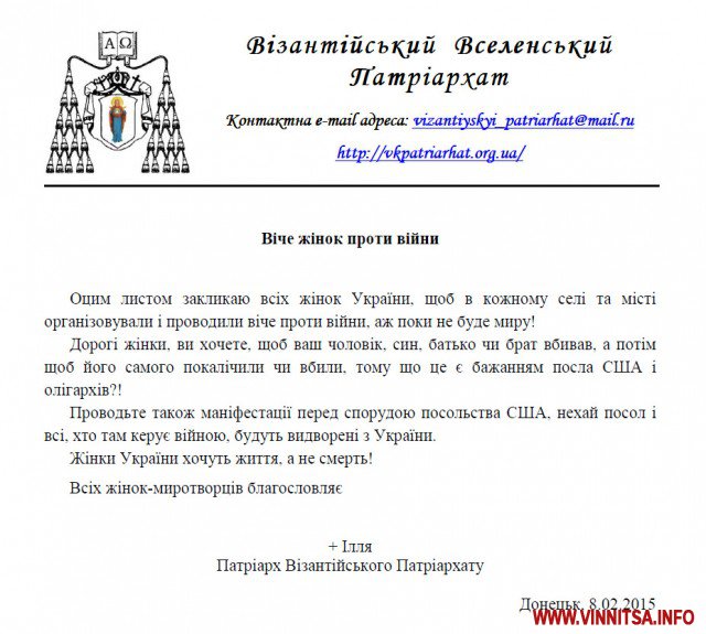 У зверненні від імені «Патріарха Візантійського патріархату Іллі» українських жінок закликають проводити маніфестації «проти війни» в кожному місті та селі, а ще перед будівлею посольства США, «щоб усі ті, хто керує війною, були видворені з України». Зазначено також, що звернення складалося в Донецьку 8 лютого, тобто, після потужного вибуху, в результаті якого, за відомостями нардепів Д. Яроша і Б. Філатова, були знищені до 10 «Градів» з боєкомплектами...