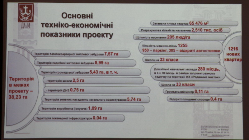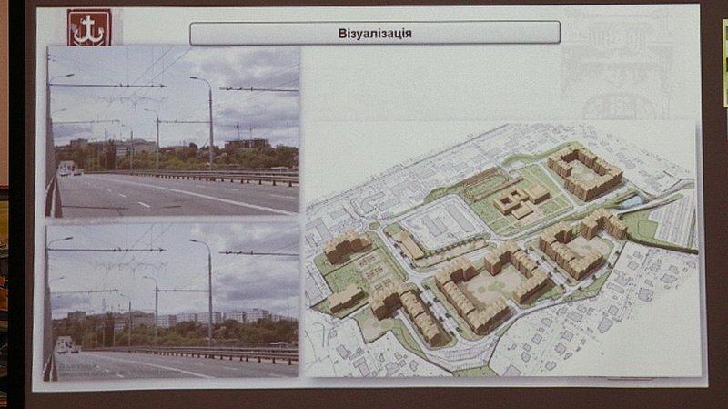 Як розповів під час презентації проекту представник комунального підприємства Олександр Шевчук, в східній частині території забудови запланували розмістити багатоквартирні житлові будинки на 6 поверхів, а поряд – двоповерховий дитячий садочок на 90 місць. За попередньою документацію, неподалік житлового комплексу також мав бути торговий центр з підземним паркінгом.