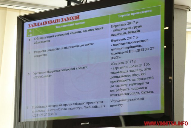 Представник дошкiльного навчального закладу № 27 Тетяна Рожок презентувала проект «Сенсорна кiмната Лого Смайл». «Метою нашого проекту є успiшна соцiальна адаптацiя дiтей з особливими освiтнiми потребами шляхом обладнання у нашому закладi сенсорної кiмнати. Наш заклад комбiнованого типу, де поруч з групами загального розвитку функцiонують групи для дiтей з вадами мовлення. Садок вiдвiдує 370 вихованцiв, згiдно заключення психолого-медико-педагогiчної комiсiї 96 з них мають рiзнi мовленнєвi порушення, троє дiтей мають порушення емоцiйної i поведiнкової сфери. Я переконана, що сенсорна кiмната розширить дiапазон можливостей для педагогiв щодо надання дiагностично-консультативної, корекцiйно-вiдновлювальної i психологiчної допомоги цим дiтям», – каже Тетяна Рожок.