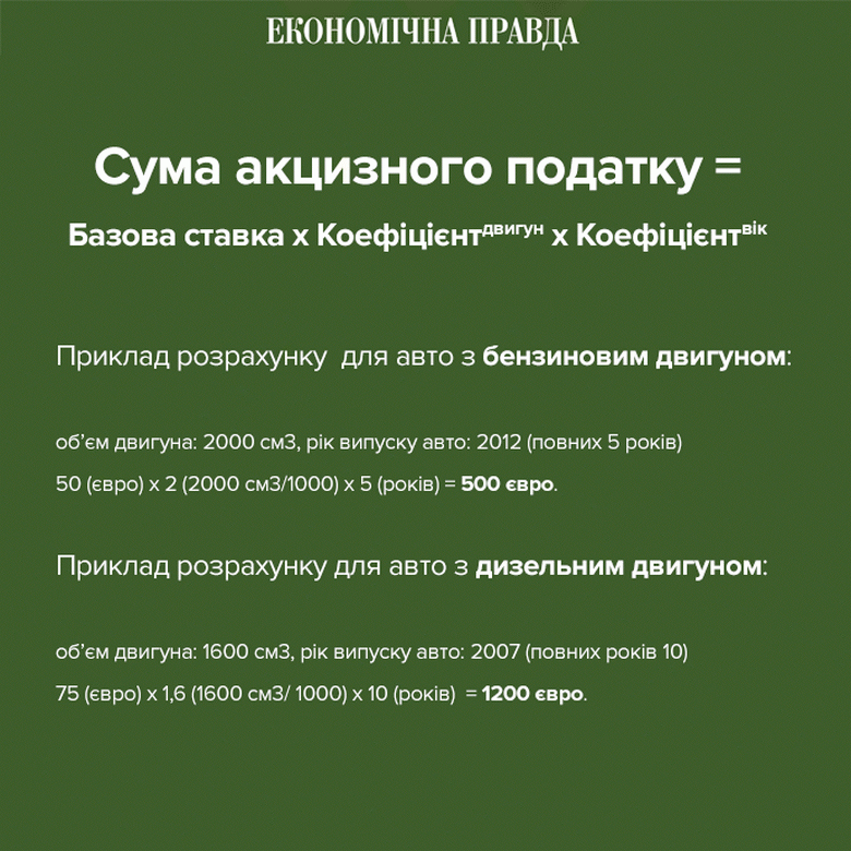 Йдеться саме про базові ставки, до яких ще будуть застосовуватися коефіцієнти. Фактично розмір акцизного податку, який треба буде сплатити, дорівнюватиме базовій ставці, помноженій на коефіцієнт двигуна та вік машини.