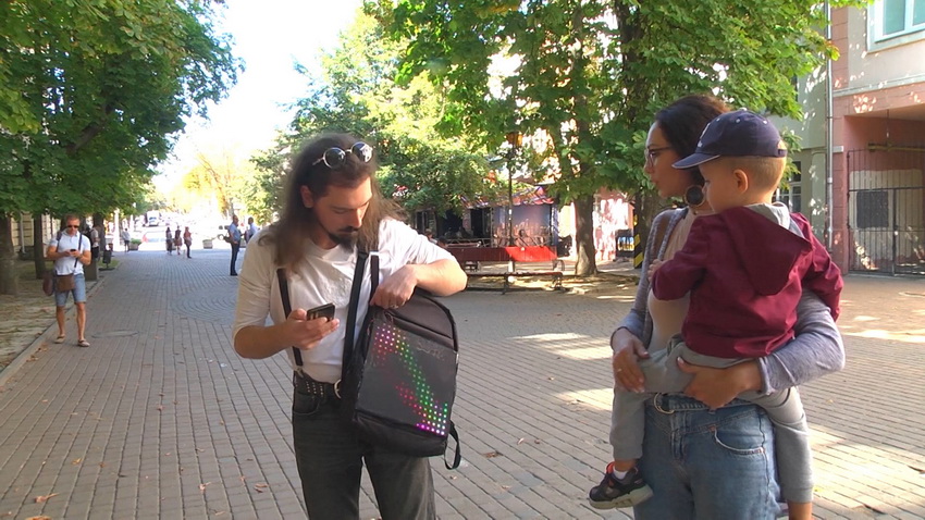 Прогулюючись вулицями Вінниці, Олександр «притягує» до своєї спини чимало поглядів перехожих. Його рюкзак — повноцінний екран.