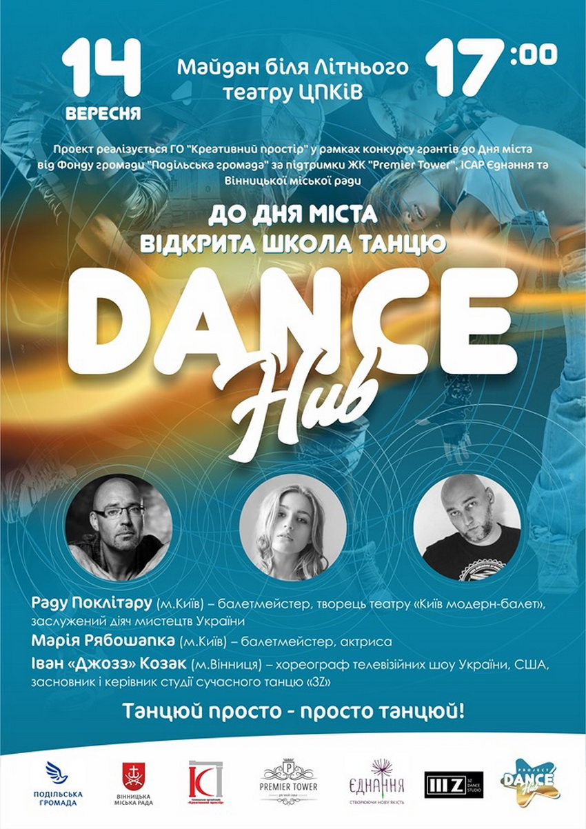 14 вересня о 17:00 на майдані біля Літнього театру у Центральному міському парку відбудеться «DanceHub» – відкрита школа танцю для вінничан та гостей міста. Організатори обіцяють феєричне танцювальне дійство без обмеження у доступі глядачів та з інтерактивними майстер-класами від Раду Поклітару, Марії Рябошапки (м.Київ) та Івана Козака, відомого як Джозз (м.Вінниця).