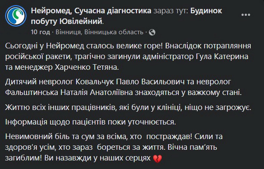 «Внаслідок ракетного удару по Вінниці отримав поранення та важкі опіки наш колега та друг, чудовий дитячий невролог Павло Ковальчук, який в момент атаки консультував в медичному центрі Нейромед. Зараз Павло перебуває в опіковому відділенні, на нього чекає ряд складних дороговартісних операцій, тому просимо усіх небайдужих долучитися до збору коштів на лікування», - йдеться в повідомленні центру.