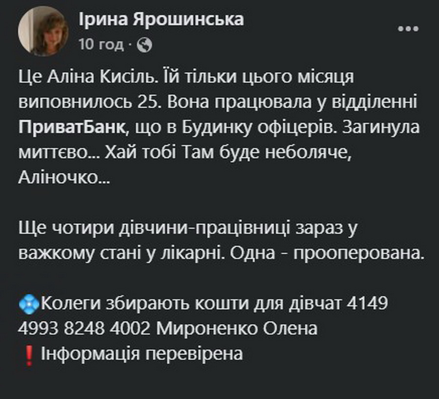 Загинула 25-річна Аліна Кисіль. Дівчина працювала у відділенні «Приватбанку», що розташований у Будинку офіцерів. Чотири дівчини, які також працювали у банку разом з Аліною госпіталізовані у важкому стані.