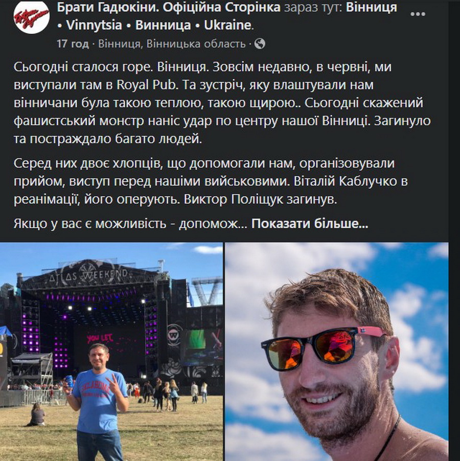 По інформації з офіційної сторінки тернопільського гурту «Брати Гадюкіни», в епіцентрі трагедії опинилися двоє хлопців, які допомагали влаштовувати виступ гурту у Вінниці.