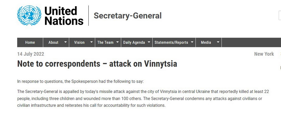 Генеральний секретар ООН Антоніу Гутерреш засудив ракетний удар росії по Вінниці.
