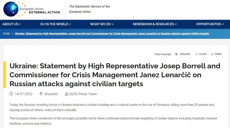 «Євросоюз рішуче засуджує невибіркові обстріли цивільних об'єктів, які тривають, включно з лікарнями, школами та укриттями. Ці звірства у Вінниці - останні в низці жорстоких нападів, цілями яких стали мирні жителі та цивільна інфраструктура.