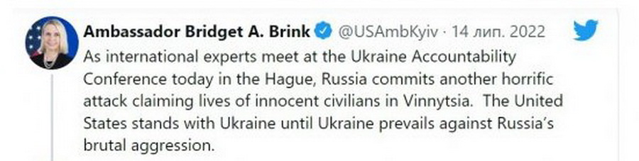 Посол США в Україні Бріджит Брінк також відреагувала на ракетний обстріл цивільного населення у Вінниці, який відбувся саме у день міжнародної Конференції в Гаазі.