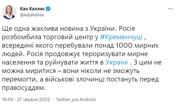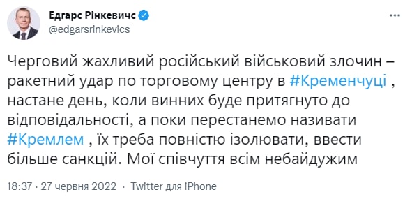 «Черговий жахливий російський військовий злочин – ракетний удар по торговому центру в Кременчуці , настане день, коли винних буде притягнуто до відповідальності, а поки перестанемо називатиКремлем , їх треба повністю ізолювати, ввести більше санкцій», - написав міністр закордонних справ Латвії Едгарс Рінкевичс.