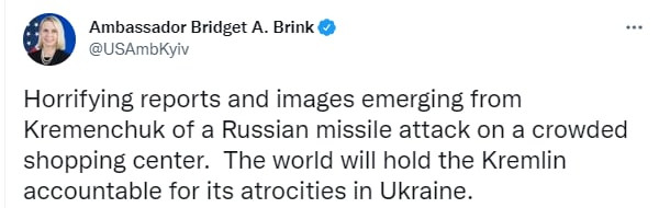 «Світ притягне Кремль до відповідальності за звірства в Україні», - написала пані посол США в Україні Бріджит Брінк.