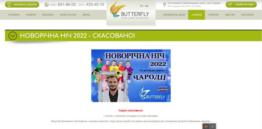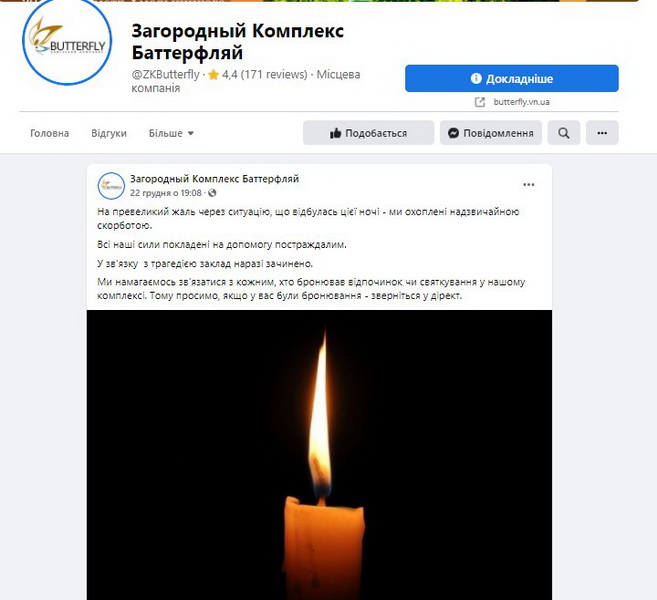 «У зв'язку з трагічною ситуацією усі події скасовано. Якщо Ви бронювали святкування у нашому комплексі, будь ласка очікуйте на дзвінок від менеджера для погодження деталей повернення завдатку». З таким оголошенням у соціальних мережах та на офіційному сайті звернулися у заміському комплексі «Батерфляй».