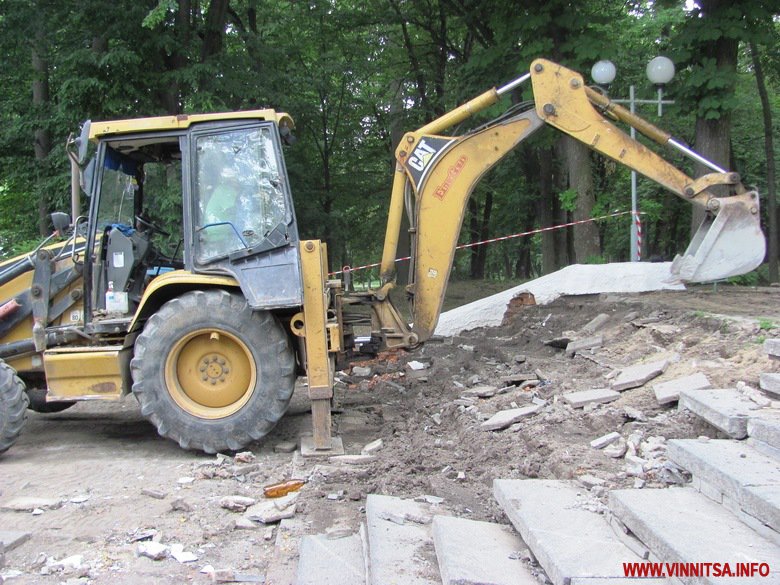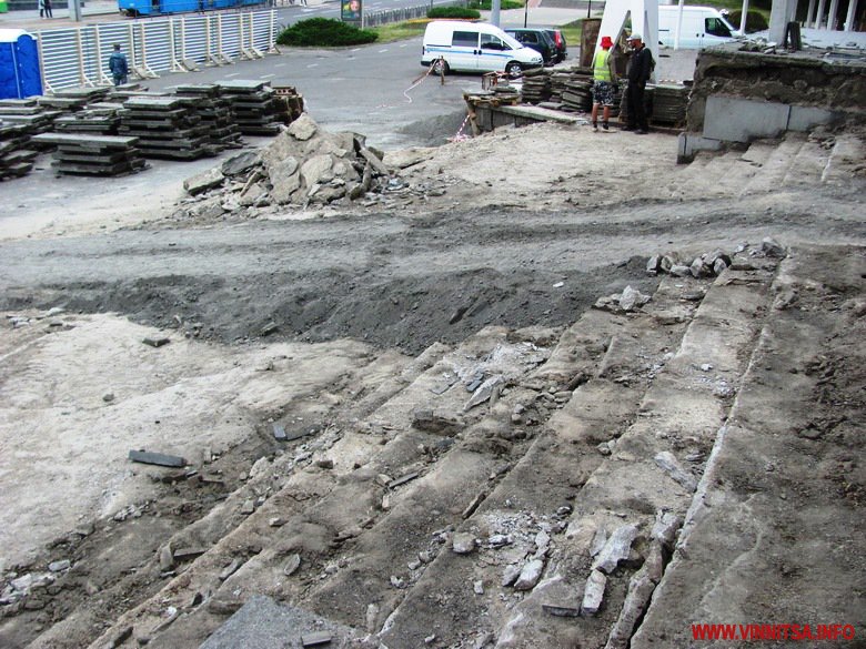 Більшу частину сходів уже демонтували. Старі плити складають за допомогою екскаватора.