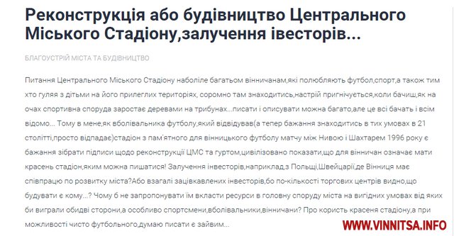 На сайті петицій до Вінницької мерії з’явилися офіційна відповідь щодо реконструкції Центрального міського стадіону із залученням інвесторів.