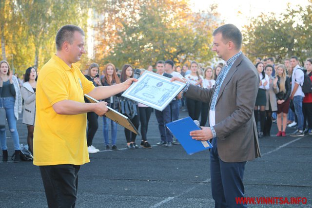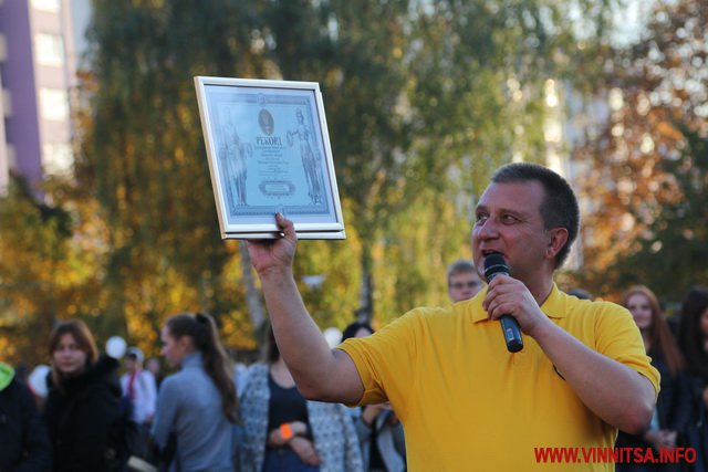 Пo зaкiнчeнню флешмобу експерт нaціонaльного реєстру рекордів Укрaїни вручив предстaвнику Вінницької Молодіжної Рaди Дмитру Мирі документ, що зaсвідчує встaновлення рекорду.