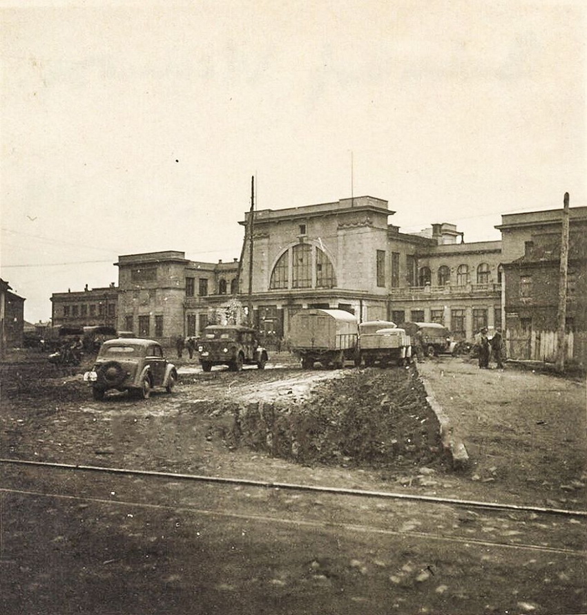 Фотографія Вінницького вокзалу часів Другої світової війни. Знімок датований 9 березня 1944 року. Це одна з останніх світлин тодішнього вокзалу, через 10 днів його підірвали.