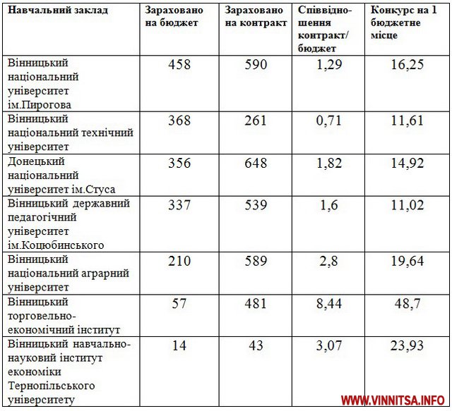 Вінницький торговельно-економічний інститут Київського національного торговельно-економічного університету. Зараховано на бюджет – 57 осіб, на контракт – 481. Конкурс на одне бюджетне місце становив 48,7.