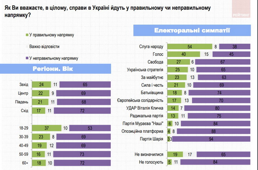 Отже, 68% українців вважають, що країна рухається у неправильному напрямку, 22% – у правильному. 10% – не визначилися. У порівнянні з початком лютого зросла кількість тих, хто оцінює напрям розвитку як правильний.