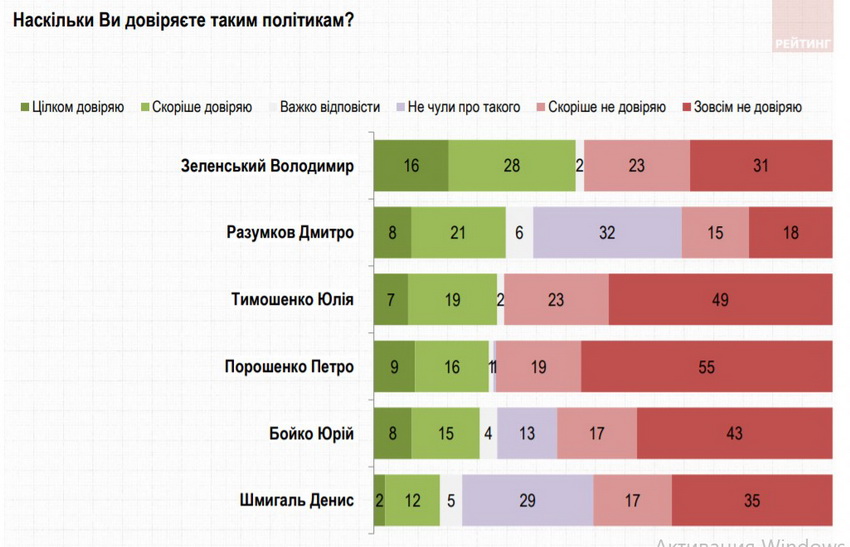 Дмитру Разумкову довіряють 29% і не довіряють – 33%, ще 32% не знають його. Юлії Тимошенко довіряють 26%, не довіряють – 72%. Петру Порошенкудовіряють 25%, не довіряють – 74%. Юрію Бойку довіряють 23%, не довіряють – 60%, не знають його – 13%. Денису Шмигалю довіряють 14%, не довіряють – 52%, майже третина не чули про такого.