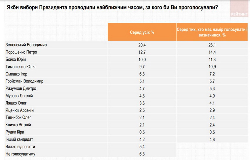 Президентський рейтинг очолює В. Зеленський. Якби вибори відбулися найближчим часом то його підтримали б 23,1% тих, хто має намір голосувати та визначився із вибором. За П. Порошенкапроголосували б 14,4%, Ю. Бойка – 11,3%, Ю. Тимошенко – 10,9%. І. Смешка підтримують 7,2%, В. Гройсмана – 5,7%, Д. Разумкова – 5,3%, Є. Мураєва – 4,9%, О. Ляшка – 4,1%, А. Яценюка – 2,9%, О. Тягнибока та В. Кличка – по 2,4%.