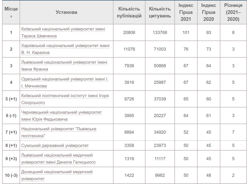 У рейтинговій таблиці українські університети ранжовані за індексом Гірша – кількісним показником, що базується на числі наукових публікацій і кількості їх цитувань.