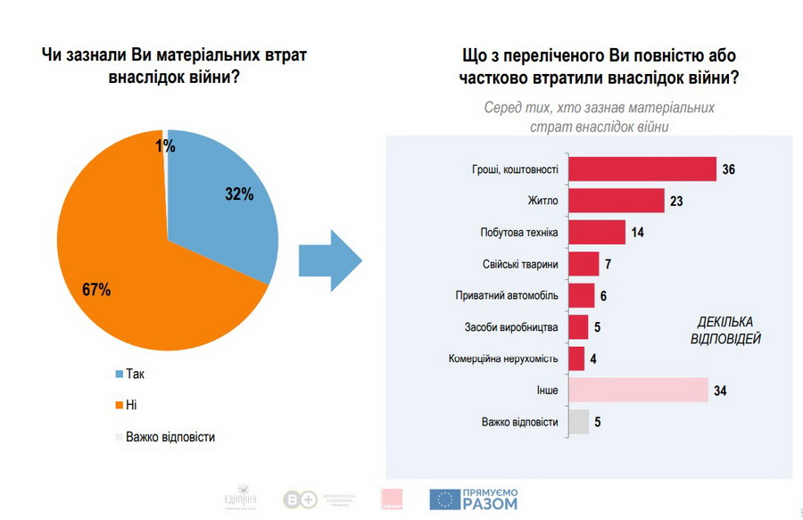 Більше половини мешканців територій, де були, чи ще тривають бойові дії, зазнали втрат. Серед втрат найчастіше називали гроші – 36%, житло – 23%, побутову техніку – 14%. Ще 7% говорили, що втратили свійських тварин, 6% - автомобіль, 5% - виробництво, 4% - комерційну нерухомість.