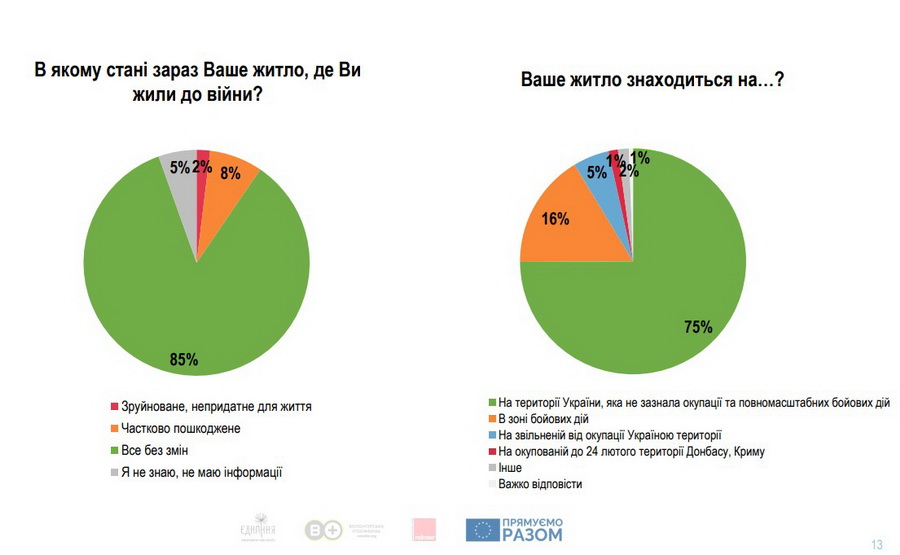 Кожен десятий опитаний зазначив, що його житло або зруйноване (2%), або ж пошкоджене (8%). Ще 5% не знають в якому стані їхнє помешкання зараз.