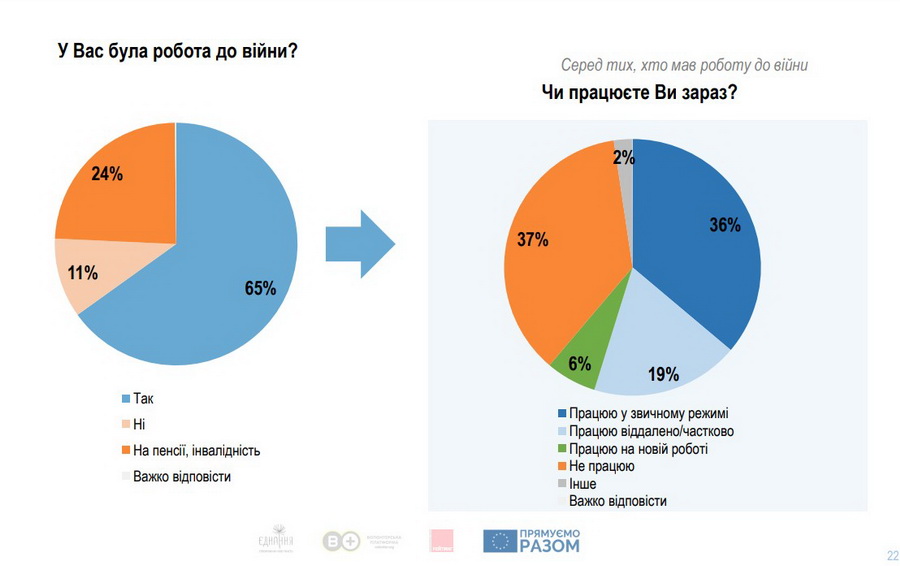 Наразі серед тих, хто мав роботу до війни, працюють 61%: повноцінно – 36%, віддалено або частково – 19%, знайшли нову роботу – 6%. Натомість 37% втратили роботу і не працюють зараз.
