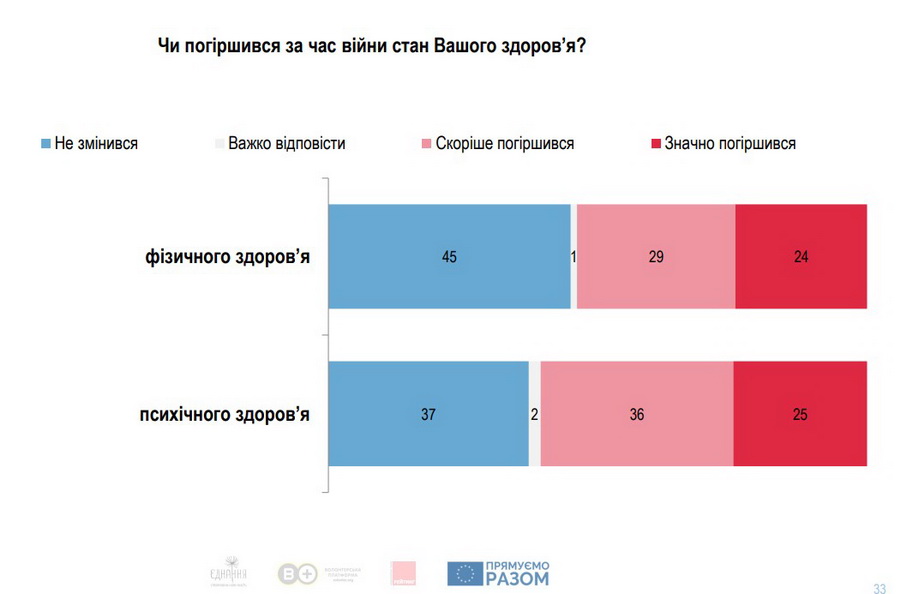 Більше половини опитаних зазначили про погіршення стану власного фізичного здоров’я, більше 60% - стану психічного здоров’я.